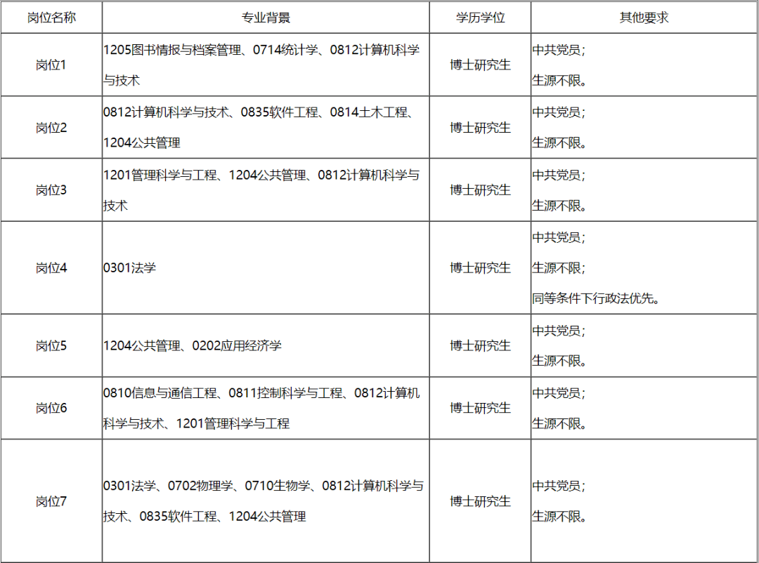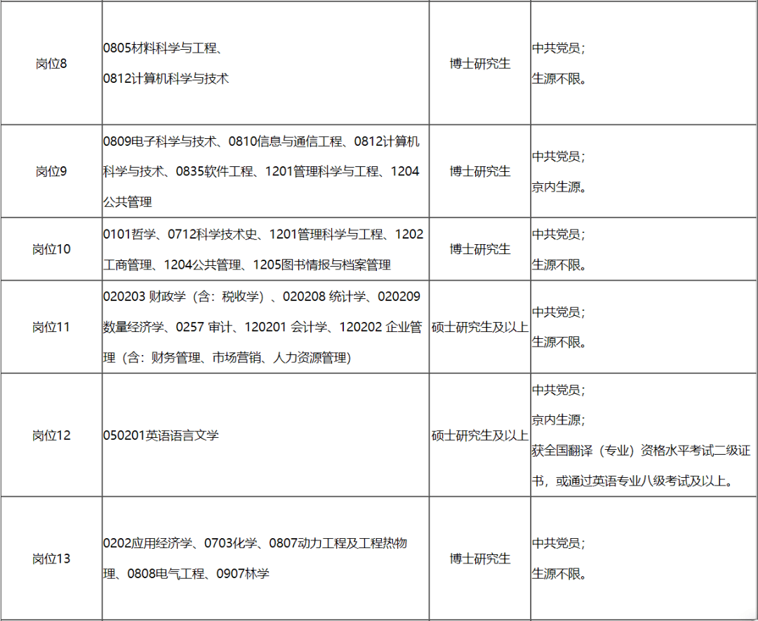 备注:1.以上招聘岗位学历学位要求为应届毕业生即将获得的最高学历学位,当年如期取得毕业证、学位证。岗位专业要求为应届毕业生即将获得的最高学历学位对应专业。2.上述专业主要依据教育部《学位授予和人才培养学科目录》(2018年4月更新版)。对于所学专业接近但不在上述参考目录中的,应聘人员可与单位联系,确认报名资格。