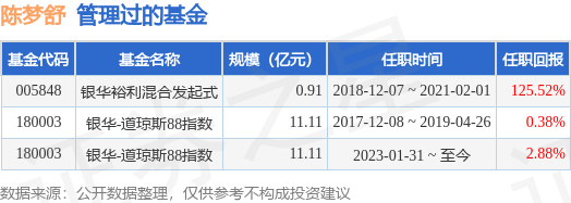 陈梦舒先生:美国西佛罗里达大学工程硕士,曾就职于普天信息技术研究院TechOpyoins Consulting Inc.、中国电信,2010年9月加入银华基金,历任助理行业研究员、行业研究员、研究组长,现任研究部总监助理兼基金经理助理,自2017年12月8日至2021年2月1日担任银华裕利混合型发起式证券投资基金基金经理。2023年01月31日担任银华-道琼斯88精选证券投资基金的基金经理。