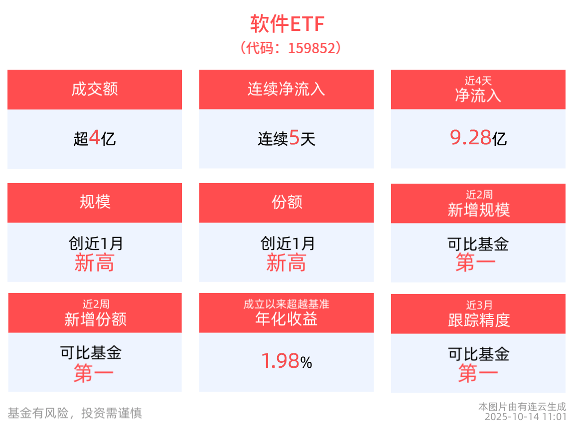 从资金净流入方面来看,软件ETF近5天获得连续资金净流入,最高单日获得5.07亿元净流入,合计“吸金”9.37亿元。