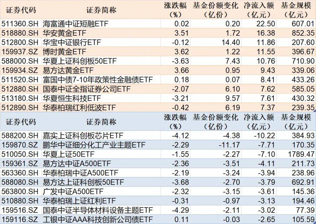 与此同时,嘉实上证科创板芯片ETF基金份额减少4.38亿份,净流出额为10.22亿元;鹏华中证细分化工产业主题ETF基金份额减少11.17亿份,净流出额为7.71亿元;华夏上证50ETF基金份额减少2.27亿份,净流出额为7.1亿元。