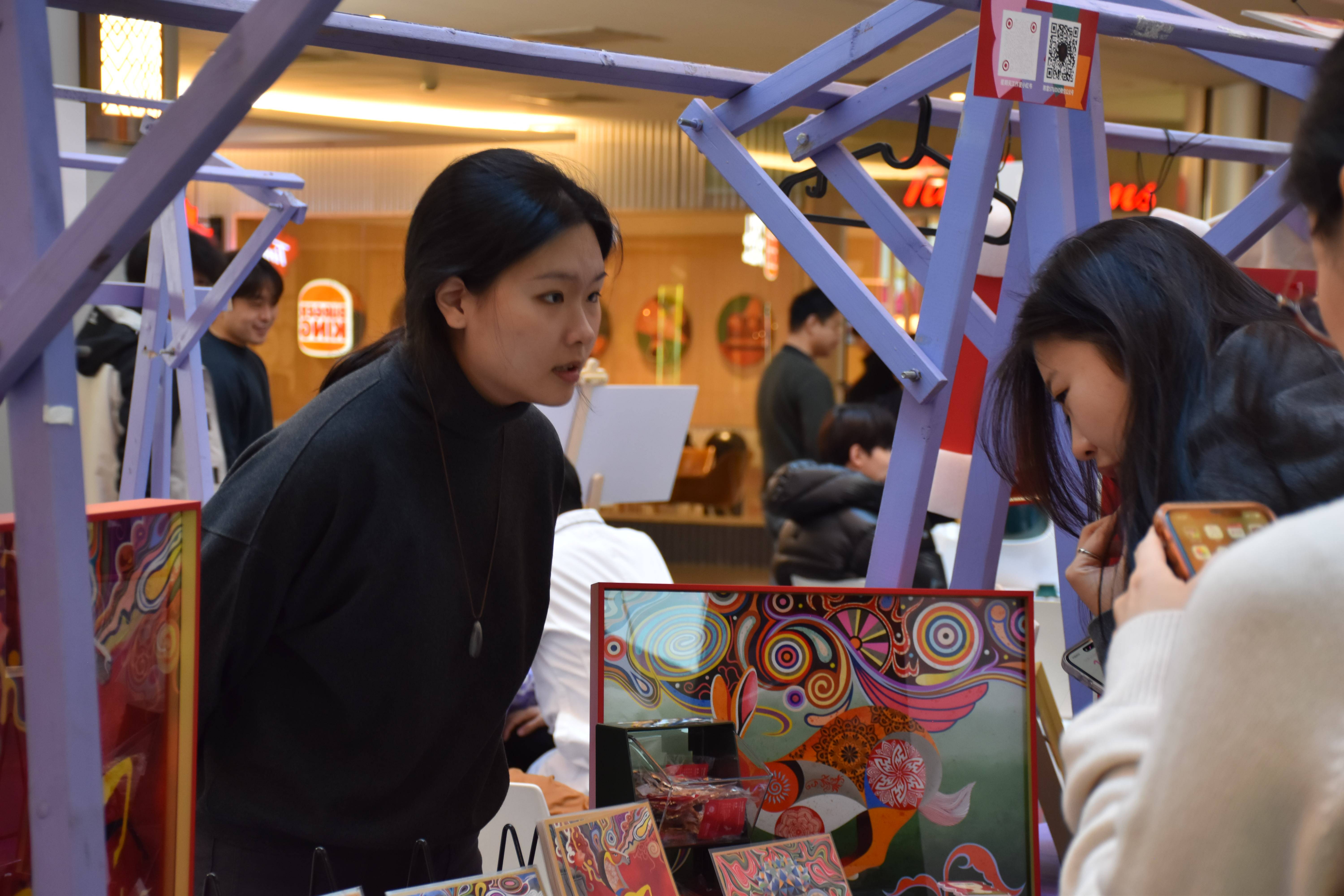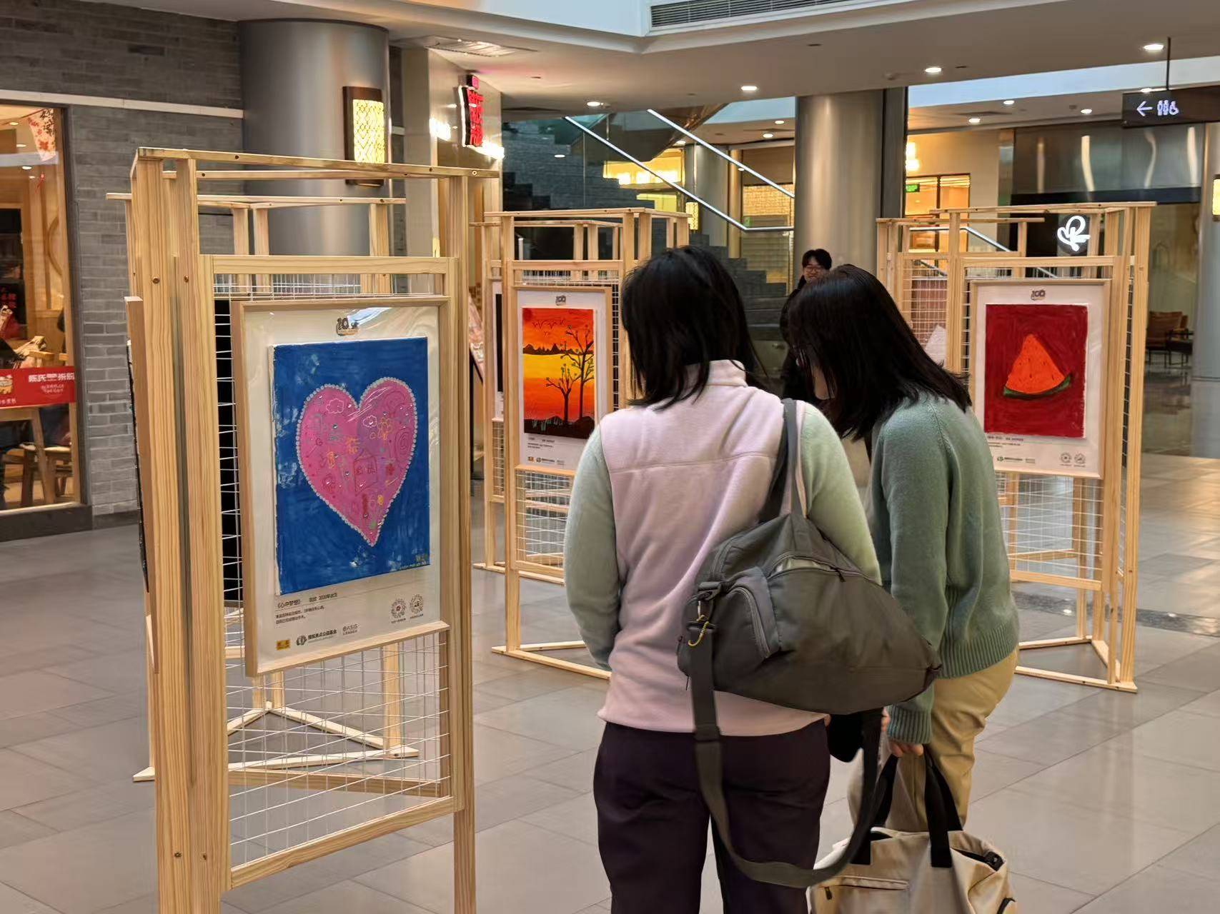 集市展出了来自基金志愿者项目“100分钟陪伴计划”的特别作品——这些画作由先心病儿童与志愿者共同创作,每一笔色彩都承载着孩子们的故事与梦想。在布展时,就有来往人群驻足,想了解画作背后的故事。