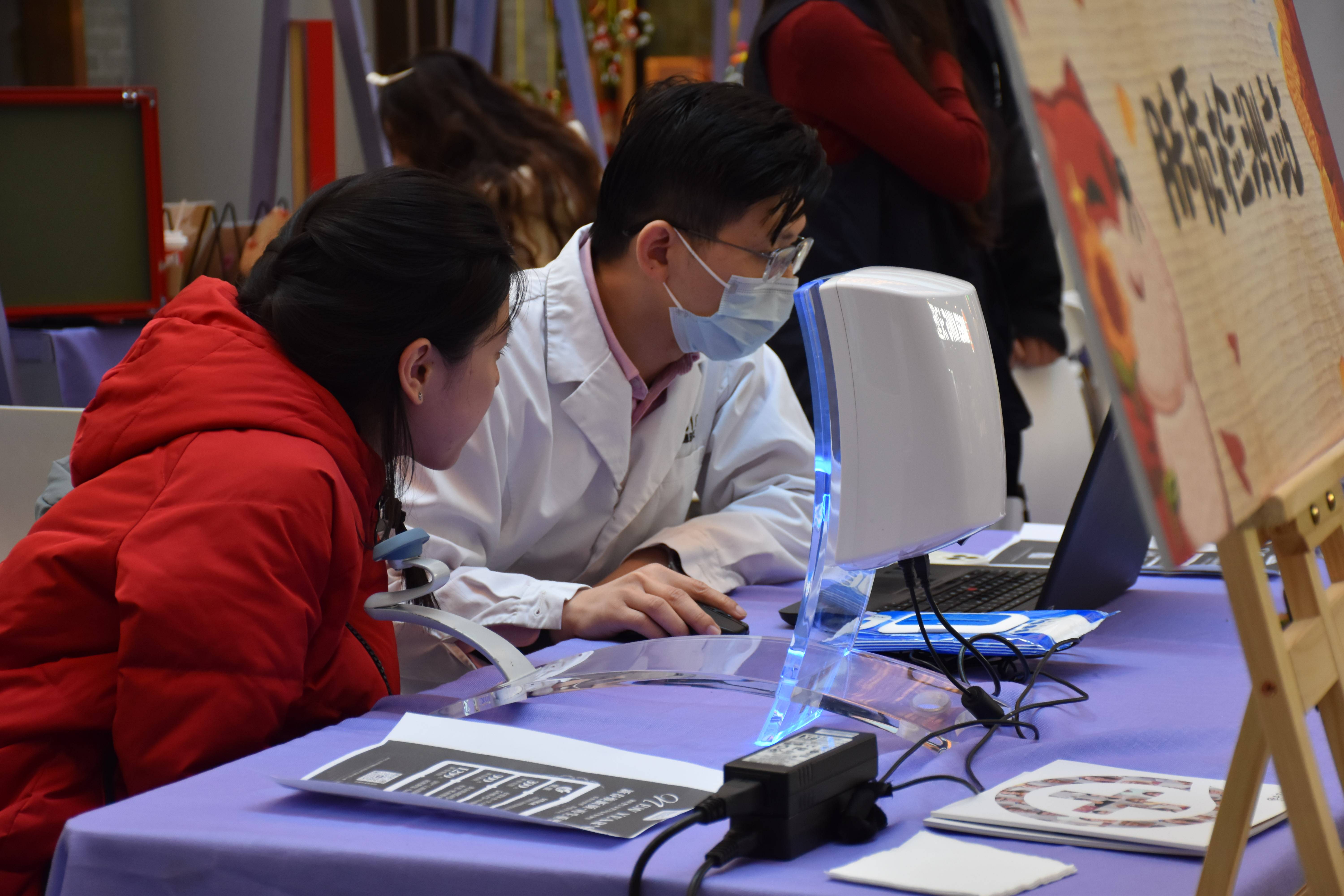 北京明德医院在本次市集开设肤质检测和中医养生科普摊位。圣诞节当日,医院还设置了AI目诊仪体验区。