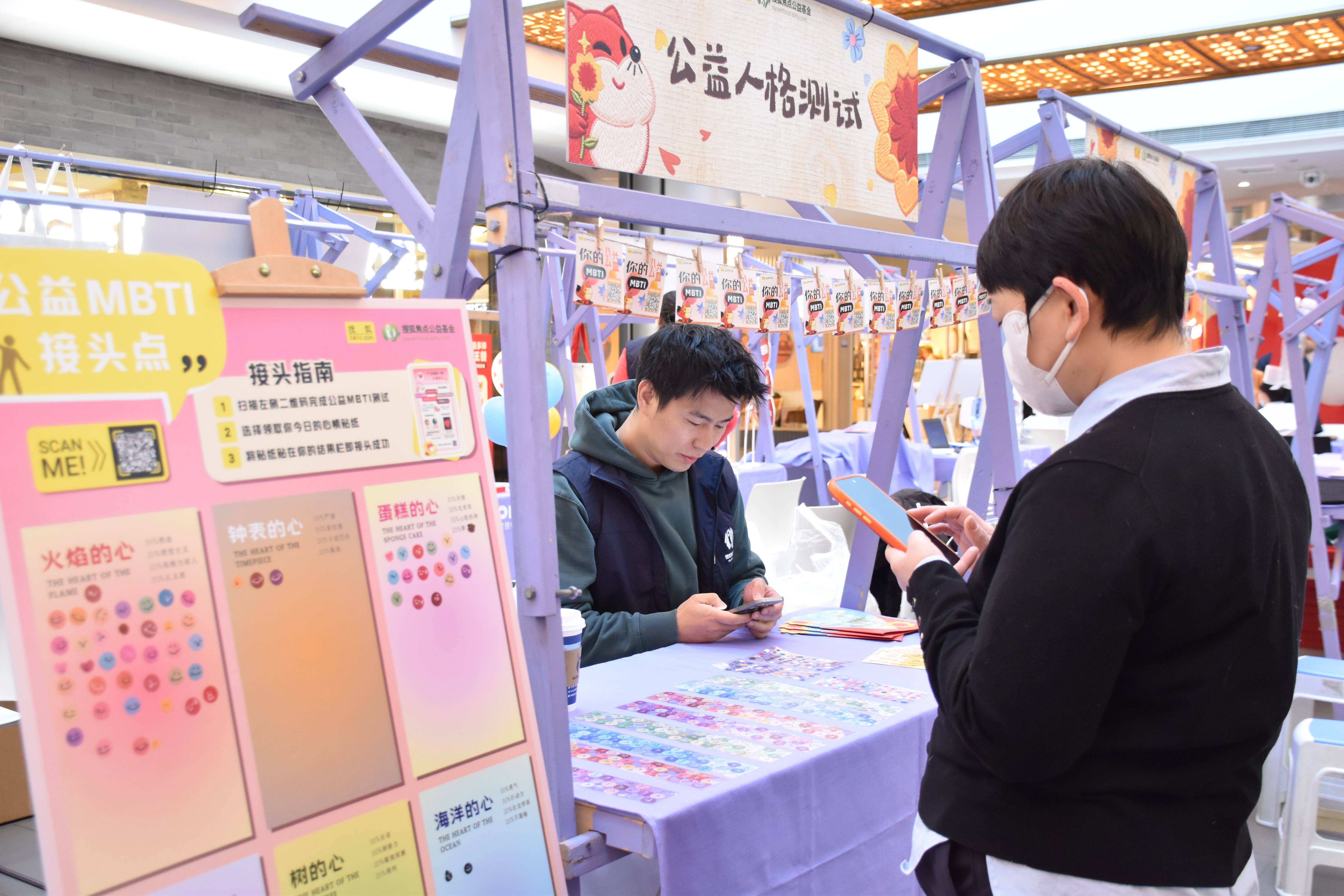基金自行策划设计了“公益人格测试”摊位,许多路人愿意停留、参与这场共十二题的小测试。参与完测试后,众人纷纷将当日的心情贴纸贴在一旁的互动区,查看和自己结果相同的陌生“有缘人”数量,打卡拍照。