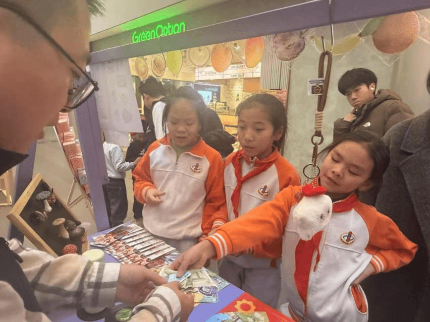 在公益盲盒摊位,几个小朋友因无法扫码捐款参与活动,便手捧零钱来抽盲盒。一位先心病患儿母亲得知筹集的资金将用于救助先心病儿童后,毫不犹豫地捐赠善款。