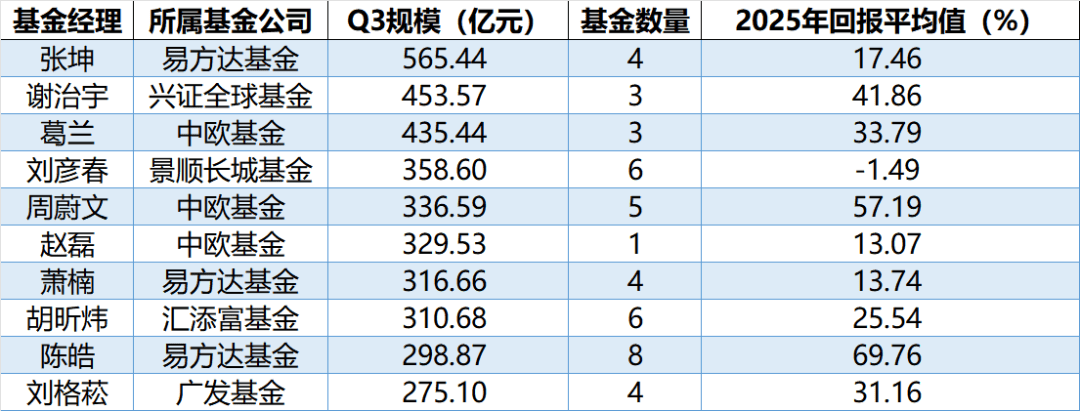 以2025年三季度末的管理规模为基准,排名前十的顶流基金经理中,有四名未能跑赢大盘,仅中欧基金的周蔚文、易方达的陈皓取得了50%以上的收益率。