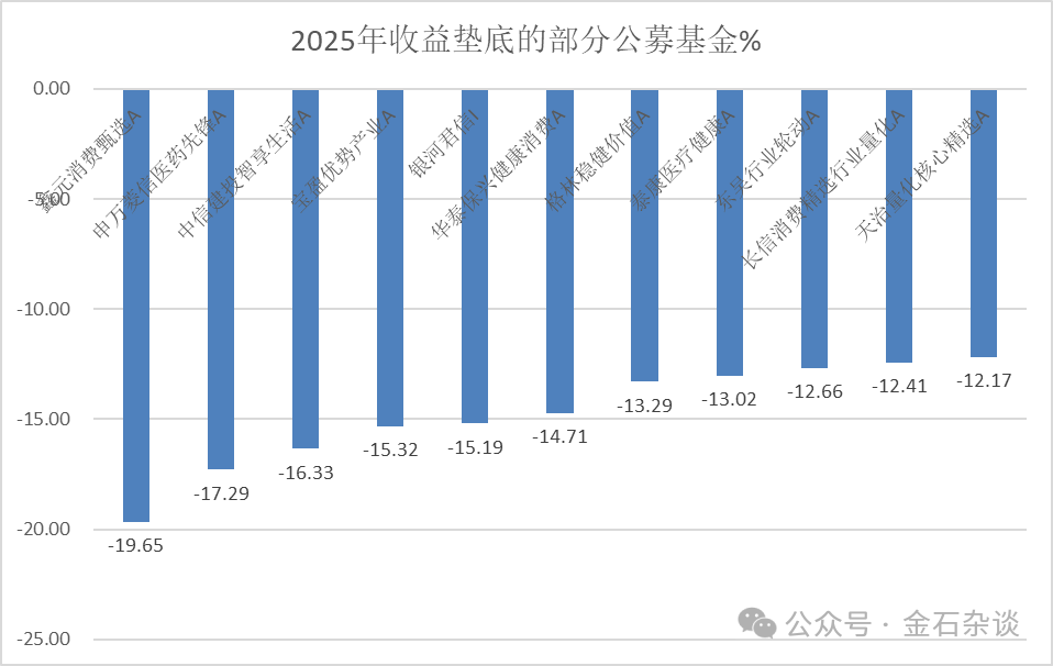 说完基金的荣誉榜,今天简单说下几只倒数的基金。根据wind数据,今年倒数第一的基金是鑫元消费甄选A,年度亏损高达19.65%;其次是申万菱信医药先锋A,同样亏损超17%,其他还有多款产品亏损超15%。