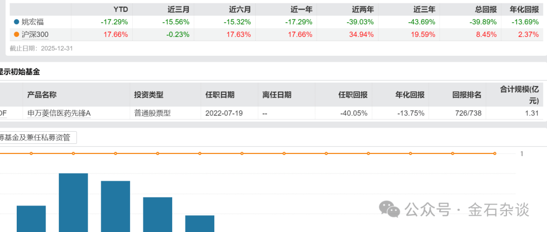 2025年医药曾一度成为市场主线,即便收益不怎么可观,也不至于年度亏损吧。但是,申万菱信医药先锋A不仅亏了,而且亏损17%。虽然说,历任的三名基金经理都亏损,但是现任基金经理姚宏福却是在医药行情最好的时代。