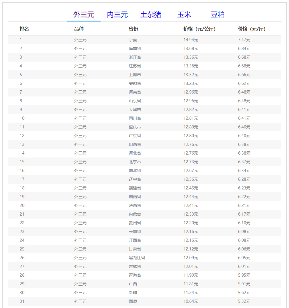 外三元排行前三:宁夏回族自治区14.94元/公斤、海南省13.68元/公斤、浙江省13.36元/公斤;
