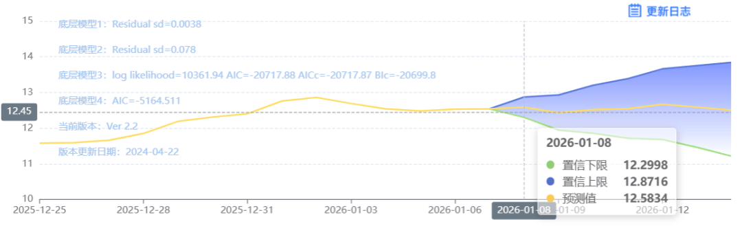 玄田算法是由项目课题组团队原创的非经典逻辑数值聚合理论和不确定性预测方法,构建了基于一致模算子的生猪价格预测模型。该模型采用的聚合函数及一致模相关理论与方法已获得多项国家自然科学基金和省级自然科学资金资助,并获得多项省级自然科学奖奖项。01月08日预测猪价为12.5834,置信区间在12.2998--12.8716之间。01月09日预测猪价为12.4310;01月10日预测猪价为12.5183。