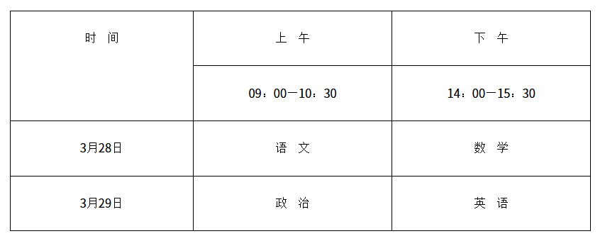 文化考试科目为语文、数学、政治、英语四科,每科满分为150分,四科满分为600分,使用国家通用语言文字作答。