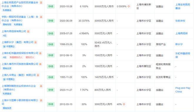 从投资的金融机构看,长宁国资在基金、小贷、担保等领域均有布局,包括上海生物医药产业股权投资基金合伙企业(有限合伙)、宇航一期股权投资基金(上海)合伙企业(有限合伙)、上海东虹桥融资担保、上海长宁国智股份有限公司、上海科创母基金三期等都有其参股的身影。