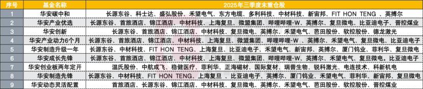 除华安创业板两年定开主要聚焦创业板标的之外,其余8只基金的重仓股重叠度较高,主要集中于高端制造与出行消费两大方向。