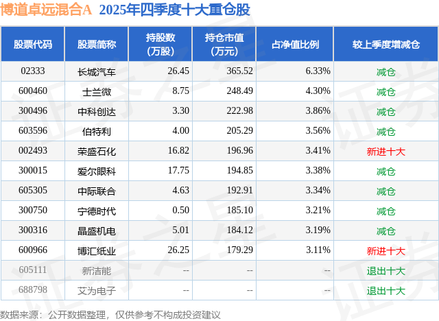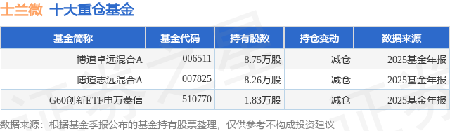 根据2025基金年报公募基金重仓股数据,重仓该股的公募基金共3家,其中持有数量最多的公募基金为博道基金的博道卓远混合A。博道卓远混合A目前规模为0.52亿元,最新净值1.9255(4月7日),较上一交易日上涨0.24%,近一年上涨19.68%。该公募基金现任基金经理为袁争光。袁争光在任的基金产品包括:博道志远混合A,管理时间为2019年9月17日至今,期间收益率为56.04%;博道安远6个月持有期混合,管理时间为2020年1月17日至今,期间收益率为25.03%;博道明远混合A,管理时间为2024年1月30日至今,期间收益率为11.41%。