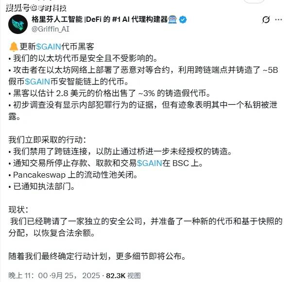 事件详情:9月25日,GriffinAI 代币 GAIN 因 LayerZero 跨链协议漏洞遭攻击,黑客通过伪造以太坊合约节点,非法增发 50 亿枚 GAIN 代币抛售,1 小时内价格从 0.163 美元跌至 0.003 美元,暴跌 98%。黑客将赃款兑换为 BNB 后跨链转入以太坊,最终流向 Tornado Cash 混币平台。截至 9 月 30 日,GriffinAI 官方未披露平台直接资产损失,主流安全机构也未发布链上资金追踪的明确损失数据,但代币市值蒸发超 1.2 亿美元,且已有部分用户因价格产生实际亏损。