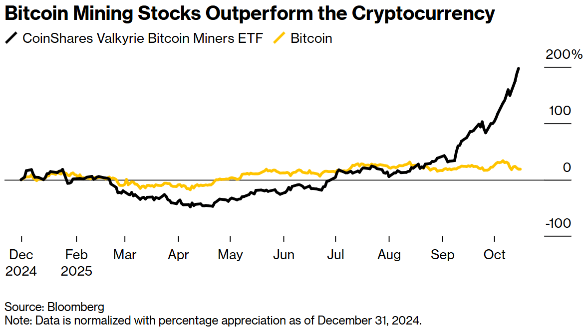 不过,今年加密货币复苏的最大赢家不是比特币持有者,而是矿企本身。一只追踪上市矿企的基金今年迄今已飙升逾150%。与过去比特币上涨时矿企也会跟着上涨的周期不同,这些公司现在被视为科技基础设施公司,因为它们正朝着这个方向转型。
