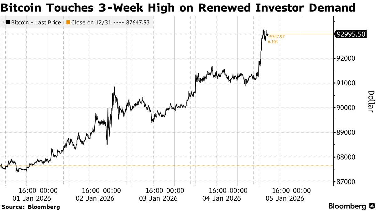 2026-01-05交易所,交易所排名,交易所排行,加密货币是什么,加密货币交易平台,加密货币平台,币安交易所,火币交易所,欧意交易所,Bybit,Coinbase,Bitget,Kraken,全球交易所排名,交易所排行智通财经APP获悉,比特币周一一度上涨2.3%,至93,323美元,为12月11日以来的最高水平;以太坊及其他加密货币也小幅走高。此次上涨发生在亚洲市场整体表现积极的背景下——在科技和人工智能相关押注的推动下,亚洲股市纷纷刷新历史高点。与此同时,在美国于周末对委内瑞拉发起“斩首式”军事行动、强行抓捕委内瑞拉总统马杜罗后,投资者涌向贵金属避险,黄金周一一度上涨2%,突破每盎司4,400美元,白银最高涨幅达4.8%。