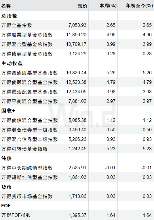 统计区间2026/1/5-2026/1/9最近一周,万得基金指数整体表现平稳。具体来看:万得全基指数上涨2.65%;万得股票型基金总指数上涨4.96%;万得混合型基金总指数上涨3.99%;万得普通股票型基金指数上涨5.26%;万得偏股混合型基金指数上涨4.79%;万得灵活配置型基金指数上涨3.98%。