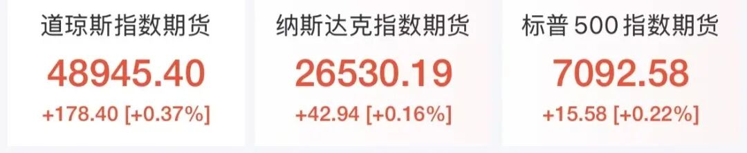 美股三大股指期货集体拉升,道琼斯指数期货涨0.37%,纳斯达克指数期货涨0.16%,标普500指数期货涨0.22%。