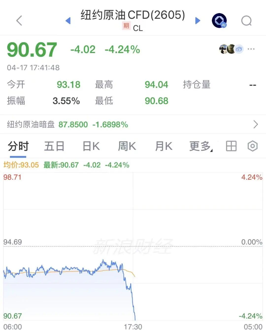 消息面上,据央视新闻报道,船舶追踪网站vesselfinder4月17日公布的数据显示,一艘悬挂巴基斯坦国旗的油轮驶入波斯湾,成为自美国13日实施封锁以来,首艘载有原油经霍尔木兹海峡驶出的油轮。