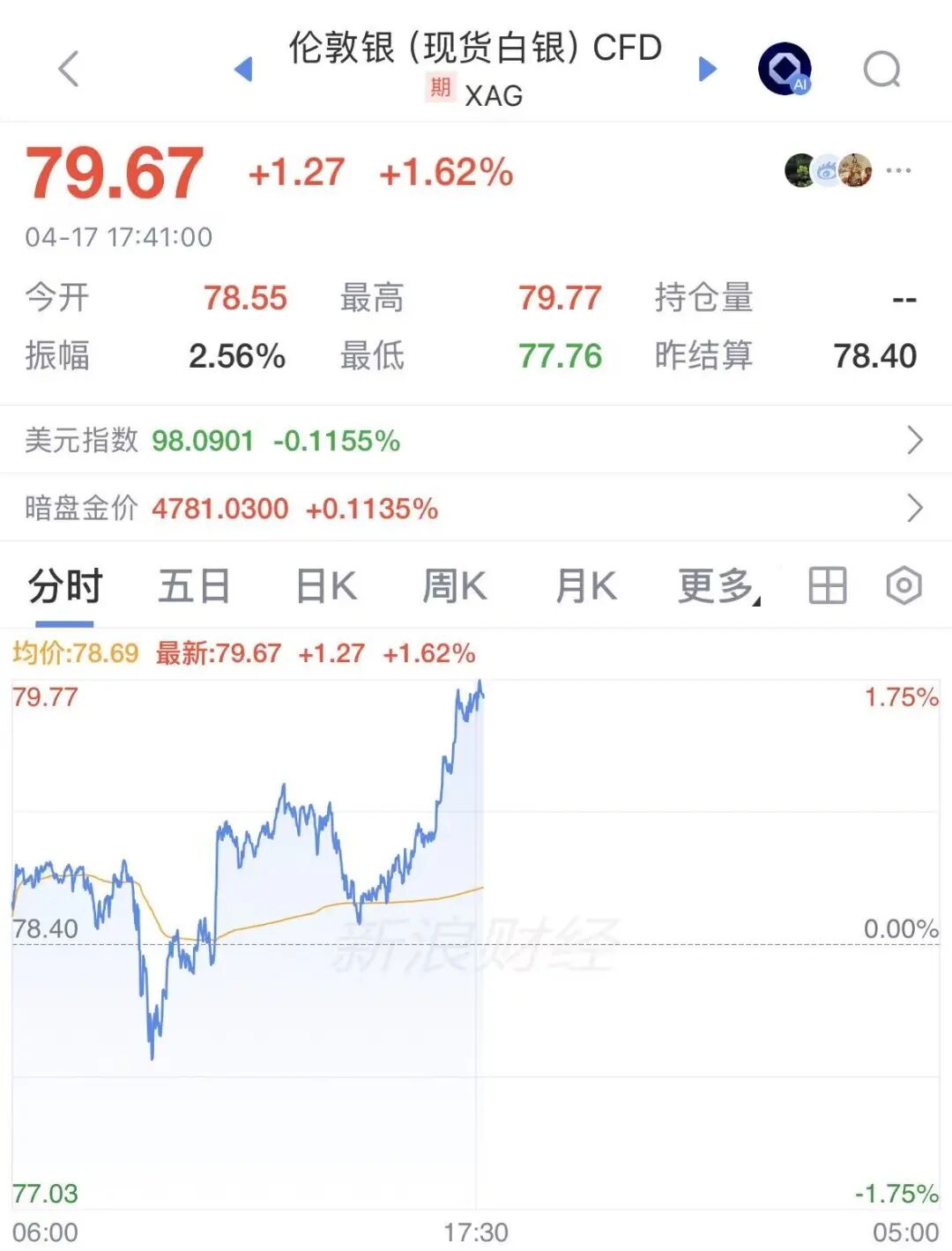 现货黄金持续震荡行情,日内涨超0.08%,报4794.62美元/盎司;现货白银拉升涨超1.62%,报79.67美元/盎司。