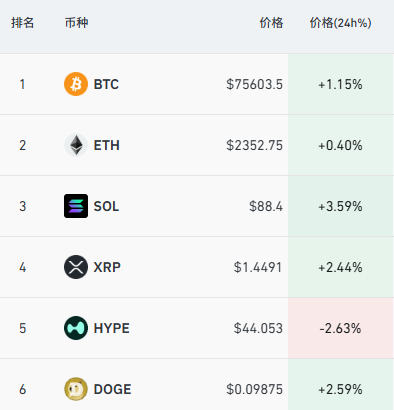 加密货币主要币种上涨,比特币突破75000美元,过去24小时,全市场超19万人爆仓。